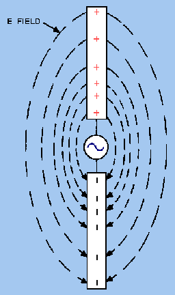 In figure 1-27, two rods replace the plates of the capacitor, and the battery is replaced by an ac source generating a 60-hertz signal. On the positive alternation of the 60-hertz generator, the electric field extends from the positively charged rod to the negatively charged rod, as shown. On the negative alternation, the charge is reversed. The previous explanation of electrons moving from one plate to the other of the capacitor in figure 1-25 can also be applied to the rods in figure 1-27. Figure 1-27. - Electric fields between elements.