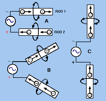 The polarity of charges and the direction of the electric fields will reverse polarity and direction periodically at the frequency of the voltage source. The electric field will build up from zero to maximum in one direction and then collapse back to zero. Next, the field will build up to maximum in the opposite direction and then collapse back to zero. This complete reversal occurs during a single cycle of the source voltage. The HALF-WAVE DIPOLE ANTENNA (two separate rods in line as illustrated in figure 1-27) is the fundamental element normally used as a starting point of reference in any discussion concerning the radiation of electromagnetic energy into space. If rf energy from the ac generator (or transmitter) is supplied to the element of an antenna, the voltage across the antenna lags the current by 90 degrees. The antenna acts as if it were a capacitor. Magnetic Field When current flows through a conductor, a magnetic field is set up in the area surrounding the conductor. In fact, any moving electrical charge will create a magnetic field. The magnetic field is a region in space where a magnetic force can be detected and measured. There are two other fields involved - an INDUCTION FIELD, which exists close to the conductor carrying the current, and the RADIATION FIELD, which becomes detached from the current-carrying rod and travels through space. To represent the magnetic field, lines of force are again used to illustrate the energy. Magnetic lines are not drawn between the rods, nor between high- and low-potential points, as the E lines that were discussed earlier. Magnetic lines are created by the flow of current rather than the force of voltage. The magnetic lines of force, therefore, are drawn at right angles to the direction of current flow. The magnetic fields that are set up around two parallel rods, as shown in figure 1-28 view A, are in maximum opposition. Rod 1 contains a current flowing from the generator, while rod 2 contains a current flowing toward the generator. As a result, the direction of the magnetic field surrounding rod 1 is opposite the direction of the magnetic field surrounding rod 2. This will cause cancellation of part or all of both magnetic fields with a resultant decrease in radiation of the electromagnetic energy. View B illustrates the fact that if the far ends of rods 1 and 2 are separated from each other while the rods are still connected to the generator at the near ends, more space, and consequently less opposition, will occur between the magnetic fields of the two rods. View C illustrates the fact that placing the rods in line makes the currents through both rods flow in the same direction. Therefore, the two magnetic fields are in the same direction; thus, maximum electromagnetic radiation into space can be obtained. Figure 1-28. - Magnetic fields around elements.