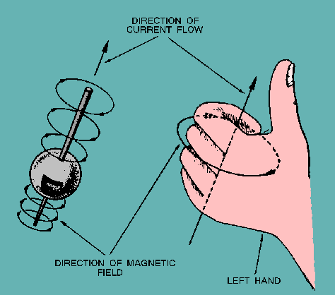 Magnetic lines of force are indicated by the letter H and are called H lines. The direction of the magnetic lines may be determined by use of the left-hand rule for a conductor: If you grasp the conductor in your left hand with the thumb extended in the direction of the current flow, your fingers will point in the direction of the magnetic lines of force. In view C of figure 1-28, the direction of current flow is upward along both halves of the elements (conductors). The lines of magnetic force (flux) form concentric loops that are perpendicular to the direction of current flow. The arrowheads on the loops indicate the direction of the field. The left-hand rule is used to determine the direction of the magnetic field and is illustrated in figure 1-29. If the thumb of the left hand is extended in the direction of current flow and the fingers clenched, then the rough circles formed by the fingers indicate the direction of the magnetic field. Figure 1-29. - Left-hand rule for conducting elements.