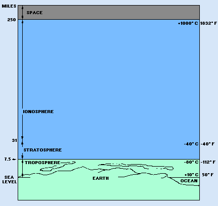 THE EFFECT OF THE EARTH'S ATMOSPHERE ON RADIO WAVES This discussion of electromagnetic wave propagation is concerned mainly with the properties and effects of the medium located between the transmitting antenna and the receiving antenna. While radio waves traveling in free space have little outside influence affecting them, radio waves traveling within the Earth's atmosphere are affected by varying conditions. The influence exerted on radio waves by the Earth's atmosphere adds many new factors to complicate what at first seems to be a relatively simple problem. These complications are because of a lack of uniformity within the Earth's atmosphere. Atmospheric conditions vary with changes in height, geographical location, and even with changes in time (day, night, season, year). A knowledge of the composition of the Earth's atmosphere is extremely important for understanding wave propagation. The Earth's atmosphere is divided into three separate regions, or layers. They are the TROPOSPHERE, the STRATOSPHERE, and the IONOSPHERE. The layers of the atmosphere are illustrated in figure 2-10. Figure 2-10. - Layers of the earth's atmosphere.