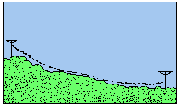 Ground Waves The ground wave is actually composed of two separate component waves. These are known as the SURFACE WAVE and the SPACE WAVE (fig. 2-11). The determining factor in whether a ground wave component is classified as a space wave or a surface wave is simple. A surface wave travels along the surface of the Earth. A space wave travels over the surface. SURFACE WAVE. - The surface wave reaches the receiving site by traveling along the surface of the ground as shown in figure 2-12. A surface wave can follow the contours of the Earth because of the process of diffraction. When a surface wave meets an object and the dimensions of the object do not exceed its wavelength, the wave tends to curve or bend around the object. The smaller the object, the more pronounced the diffractive action will be. Figure 2-12. - Surface wave propagation.