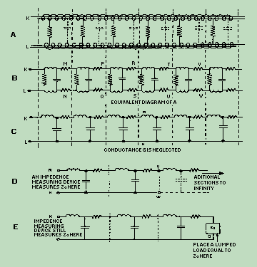 The impedance presented to the input terminals of the transmission line is not merely the resistance of the wire in series with the impedance of the load. The effects of series inductance and shunt capacitance of the line itself may overshadow the resistance, and even the load, as far as the input terminals are concerned. To find the input impedance of a transmission line, determine the impedance of a single section of line. The impedance between points K and L, in view B of figure 3-16, can be calculated by the use of series-parallel impedance formulas, provided the impedance across points M and N is known. But since this section is merely one small part of a longer line, another similar section is connected to points M and N. Again, the impedance across points K and L of the two sections can be calculated, provided the impedance of the third section is known. This process of adding one section to another can be repeated endlessly. The addition of each section produces an impedance across points K and L of a new and lower value. However, after many sections have been added, each successive added section has less and less effect on the impedance across points K and L. If sections are added to the line endlessly, the line is infinitely long, and a certain finite value of impedance across points K and L is finally reached. In this discussion of transmission lines, the effect of conductance (G) is minor compared to that of inductance (L) and capacitance (C), and is frequently neglected. In figure 3-16, view C, G is omitted and the inductance and resistance of each line can be considered as one line. Let us assume that the sections of view C continue to the right with an infinite number of sections. When an infinite number of sections extends to the right, the impedance appearing across K and L is Z0. If the line is cut at R and S, an infinite number of sections still extends to the right since the line is endless in that direction. Therefore, the impedance now appearing across points R and S is also Z0, as illustrated in view D. You can see that if only the first three sections are taken and a load impedance of Z0 is connected across points R and S, the impedance across the input terminals K and L is still Z0. The line continues to act as an infinite line. This is illustrated in view E. Figure 3-17, view A, illustrates how the characteristic impedance of an infinite line can be calculated. Resistors are added in seriesparallel across terminals K and L in eight steps, and the resultant impedances are noted. In step 1 the impedance is infinite; in step 2 the impedance is 110 ohms. In step 3 the impedance becomes 62.1 ohms, a change of 47.9 ohms. In step 4 the impedance is 48.5 ohms, a change of only 13.6 ohms. The resultant changes in impedance from each additional increment become progressively smaller. Eventually, practically no change in impedance results from further additions to the line. The total impedance of the line at this point is said to be at its characteristic impedance; which, in this case, is 37 ohms. This means that an infinite line constructed as indicated in step 8 could be effectively replaced by a 37-ohm resistor. View B shows a 37-ohm resistor placed in the line at various points to replace the infinite line of step 8 in view A. There is no change in total impedance. Figure 3-17. - Termination of a line.