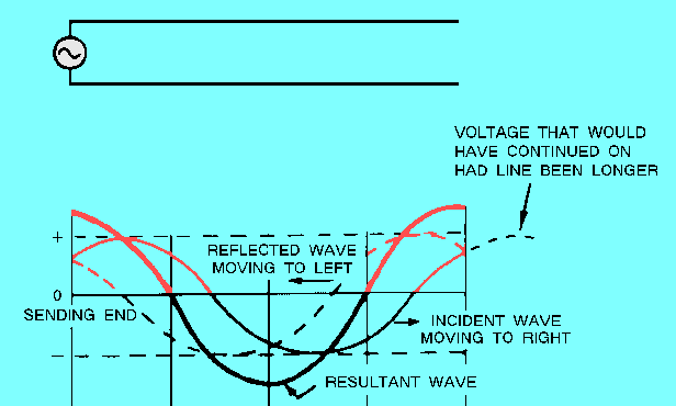 A transmission line that is not terminated in its characteristic impedance is said to be FINITE. When dc is applied to an OPEN-ENDED line, the voltage is reflected back from the open end without any change in polarity, amplitude, or shape. Current is reflected back with the same amplitude and shape but with opposite polarity. When dc is applied to a SHORT-CIRCUITED line, the current is reflected back with the same amplitude, and polarity. The voltage is reflected back with the same amplitude but with opposite polarity. When ac is applied to an OPEN-END line, voltage is always reflected back in phase with the incident wave and current is reflected back out of phase.