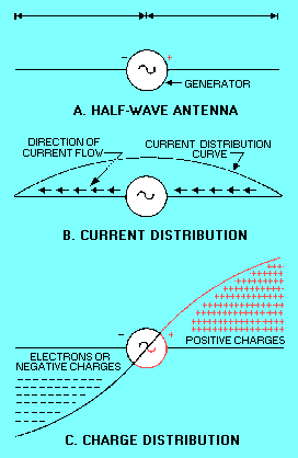 At a given time the right side of the generator is positive and the left side negative. Remember that like charges repel. Because of this, electrons will flow away from the negative terminal as far as possible, but will be attracted to the positive terminal. View B shows the direction and distribution of electron flow. The distribution curve shows that most current flows in the center and none flows at the ends. The current distribution over the antenna will always be the same no matter how much or how little current is flowing. However, current at any given point on the antenna will vary directly with the amount of voltage developed by the generator. One-quarter cycle after electrons have begun to flow, the generator will develop its maximum voltage and the current will decrease to 0. At that time the condition shown in view C will exist. No current will be flowing, but a maximum number of electrons will be at the left end of the line and a minimum number at the right end. The charge distribution view C along the wire will vary as the voltage of the generator varies. Therefore, you may draw the following conclusions: 1. A current flows in the antenna with an amplitude that varies with the generator