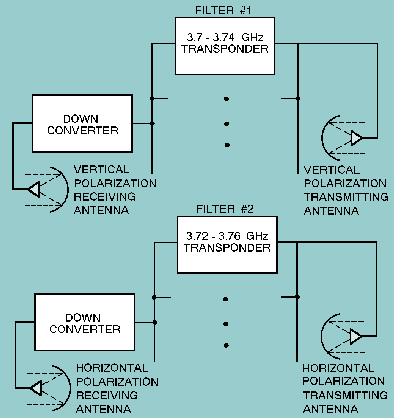 Polarization Requirements for Various Frequencies Ground-wave transmission is widely used at medium and low frequencies. Horizontal polarization cannot be used at these frequencies because the electric lines of force are parallel to and touch the earth. Since the earth acts as a fairly good conductor at low frequencies, it would short out the horizontal electric lines of force and prevent the radio wave from traveling very far. Vertical electric lines of force, on the other hand, are bothered very little by the earth. Therefore vertical polarization is used for ground-wave transmission, allowing the radio wave to travel a considerable distance along the ground surface with minimum attenuation. Sky-wave transmission is used at high frequencies. Either horizontal or vertical polarization can be used with sky-wave transmission because the sky wave arrives at the receiving antenna elliptically polarized. This is the result of the wave traveling obliquely through the Earth's magnetic field and striking the ionosphere. The radio wave is given a twisting motion as it strikes the ionosphere. Its orientation continues to change because of the unstable nature of the ionosphere. The relative amplitudes and phase differences between the horizontal and vertical components of the received wave also change. Therefore, the transmitting and receiving antennas can be mounted either horizontally or vertically. Although either horizontally or vertically polarized antennas can be used for high frequencies, horizontally polarized antennas have certain advantages and are therefore preferred. One advantage is that vertically polarized interference signals, such as those produced by automobile ignition systems and electrical appliances, are minimized by horizontal polarization. Also, less absorption of radiated energy by buildings or wiring occurs when these antennas are used. Another advantage is that support structures for these antennas are of more convenient size than those for vertically polarized antennas. For frequencies in the vhf or uhf range, either horizontal or vertical polarization is satisfactory. These radio waves travel directly from the transmitting antenna to the receiving antenna without entering the ionosphere. The original polarization produced at the transmitting antenna is maintained throughout the entire travel of the wave to the receiver. Therefore, if a horizontally polarized antenna is used for transmitting, a horizontally polarized antenna must be used for receiving. The requirements would be the same for a vertical transmitting and receiving antenna system. For satellite communications, parallel frequencies can be used without interference by using polarized radiation. The system setup is shown in figure 4-8. One pair of satellite antennas is vertically polarized and another pair is horizontally polarized. Either vertically or horizontally polarized transmissions are received by the respective antenna and retransmitted in the same polarization. For example, transmissions may be made in the 3.7 to 3.74 GHz range on the vertical polarization path and in the 3.72 to 3.76 GHz range on the horizontal polarization path without adjacent frequency (co-channel) interference. Figure 4-8. - Satellite transmissions using polarized radiation.