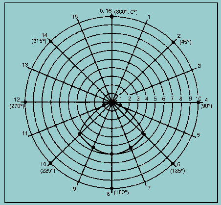 In figure 4-11, view A, the radiation pattern of the flashlight is graphed in rectangular coordinates. The illustration of the flashlight beam in view B clearly indicates the shape of the flashlight beam. This is not evident in the radiation pattern plotted on the rectangular-coordinate graph. Now look at figure 4-12. The radiation pattern shown in this figure looks very much like the actual flashlight beam. The pattern in figure 4-12 is plotted using the same values as those of figure 4-11, view A, but is drawn using polar coordinates. Figure 4-12. - Polar-coordinate graph for anisotropic radiator.