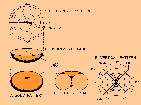 A VERTICAL PATTERN view E is obtained from the drawing of the vertical plane view D of the radiation pattern view C. The radiation pattern view C is sliced in half along a vertical plane through the antenna. This produces the vertical plane pattern in view D. Note how the vertical plane in view D of the radiation pattern differs from the horizontal plane in view B. The vertical pattern view E exhibits two lobes and two nulls. The difference between the two patterns is caused by two facts: (1) no radiation is emitted from the ends of the doublet; and (2) maximum radiation comes from the doublet in a direction perpendicular to the antenna axis. This type of radiation pattern is both NONDIRECTIONAL (in a horizontal plane) and DIRECTIONAL (in a vertical plane). From a practical viewpoint, the doublet antenna can be mounted either vertically or horizontally. The doublet shown in figure 4-14 is mounted vertically, and the radiated energy spreads out about the antenna in every direction in the horizontal plane. Since ordinarily the horizontal plane is the useful plane, this arrangement is termed NONDIRECTIONAL. The directional characteristics of the antenna in other planes is ignored. If the doublet were mounted horizontally, it would have the effect of turning the pattern on edge, reversing the patterns given in figure 4-14. The antenna would then be directional in the horizontal plane. The terms "directional" and "nondirectional" are used for convenience in describing specific radiation patterns. A complete description always involves a figure in three dimensions, as in the radiation pattern of figure 4-14. Q.17 What terms are often used to describe basic half-wave antennas? |