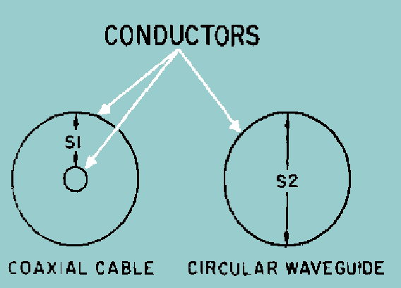 Waveguide Advantages Waveguides have several advantages over two-wire and coaxial transmission lines. For example, the large surface area of waveguides greatly reduces COPPER (I2R) LOSSES. Two-wire transmission lines have large copper losses because they have a relatively small surface area. The surface area of the outer conductor of a coaxial cable is large, but the surface area of the inner conductor is relatively small. At microwave frequencies, the current-carrying area of the inner conductor is restricted to a very small layer at the surface of the conductor by an action called SKIN EFFECT. Skin effect was discussed in NEETS, Module 10, Introduction to Wave Propagation, Transmission Lines, and Antennas, Chapter 3. Skin effect tends to increase the effective resistance of the conductor. Although energy transfer in coaxial cable is caused by electromagnetic field motion, the magnitude of the field is limited by the size of the current-carrying area of the inner conductor. The small size of the center conductor is even further reduced by skin effect and energy transmission by coaxial cable becomes less efficient than by waveguides. DIELECTRIC LOSSES are also lower in waveguides than in two-wire and coaxial transmission lines. Dielectric losses in two-wire and coaxial lines are caused by the heating of the insulation between the conductors. The insulation behaves as the dielectric of a capacitor formed by the two wires of the transmission line. A voltage potential across the two wires causes heating of the dielectric and results in a power loss. In practical applications, the actual breakdown of the insulation between the conductors of a transmission line is more frequently a problem than is the dielectric loss. This breakdown is usually caused by stationary voltage spikes or "nodes" which are caused by standing waves. Standing waves are stationary and occur when part of the energy traveling down the line is reflected by an impedance mismatch with the load. The voltage potential of the standing waves at the points of greatest magnitude can become large enough to break down the insulation between transmission line conductors. The dielectric in waveguides is air, which has a much lower dielectric loss than conventional insulating materials. However, waveguides are also subject to dielectric breakdown caused by standing waves. Standing waves in waveguides cause arcing which decreases the efficiency of energy transfer and can severely damage the waveguide. Also since the electromagnetic fields are completely contained within the waveguide, radiation losses are kept very low. Power-handling capability is another advantage of waveguides. Waveguides can handle more power than coaxial lines of the same size because power-handling capability is directly related to the distance between conductors. Figure 1-4 illustrates the greater distance between conductors in a waveguide. Figure 1-4. - Comparison of spacing in coaxial cable and a circular waveguide.