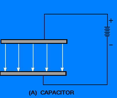 Energy Propagation in Waveguides Since energy is transferred through waveguides by electromagnetic fields, you need a basic understanding of field theory. Both magnetic (H FIELD) and electric field (E FIELD) are present in waveguides, and the interaction of these fields causes energy to travel through the waveguide. This action is best understood by first looking at the properties of the two individual fields. E FIELD. - An electric field exists when a difference of potential causes a stress in the dielectric between two points. The simplest electric field is one that forms between the plates of a capacitor when one plate is made positive compared to the other, as shown in view (A) of figure 1-11. The stress created in the dielectric is an electric field. Electric fields are represented by arrows that point from the positive toward the negative potential. The number of arrows shows the relative strength of the field. In view (A), for example, evenly spaced arrows indicate the field is evenly distributed. For ease of explanation, the electric field is abbreviated E field, and the lines of stress are called E lines. Figure 1-11A. - Simple electric fields. CAPACITOR