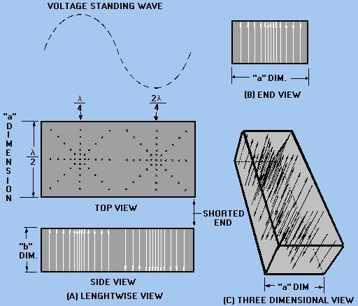Figure 1-13, view (A), shows the E-field pattern created by a voltage sine wave applied to a one-wavelength section of waveguide shorted at one end. The electric fields are represented by the arrows shown in views (B) and (C). In the top view of view (A), the tip of each arrow is represented by a dot and the tail of each arrow is represented by an X. The E field varies in density at the same sine-wave rate as the applied voltage. This illustration represents the instant that the applied voltage wave is at its peak. At other times, the voltage and the E field in the waveguide vary continuously from zero to the peak value. Voltage and E-field polarity reverse with every reversal of the input. Note that the end view shown in view (B) shows the E field is maximum at the center and minimum near the walls of the waveguide. View (C) shows the arrangement of electromagnetic fields within a three-dimensional waveguide. Figure 1-13. - E field of a voltage standing wave across a 1-wavelength section of a waveguide.