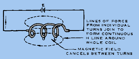 Although H lines encircle a single, straight wire, they behave differently when the wire is formed into a coil, as shown in figure 1-15. In a coil the individual H lines tend to form around each turn of wire. Since the H lines take opposite directions between adjacent turns, the field between the turns is cancelled. Inside and outside the coil, where the direction of each H field is the same, the fields join and form continuous H lines around the entire coil. Figure 1-15. - Magnetic field on a coil.
