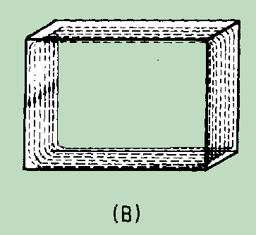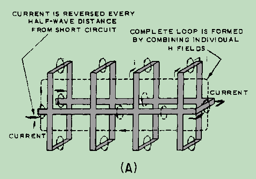 A similar action takes place in a waveguide. In figure 1-16, view (A), a two-wire line with quarter-wave sections is shown. Currents flow in the main line and in the quarter-wave sections. The current direction produces the individual H lines around each conductor as shown. When a large number of sections exist, the fields cancel between the sections, but the directions are the same both inside and outside the waveguide. At half-wave intervals on the main line, current will flow in opposite directions. This produces H-line loops having opposite directions. In view (A), current at the left end is opposite to the current at the right end. The individual loops on the main line are opposite in direction. All around the framework they join so that the long loop shown in view (B) is formed. Outside the waveguide the individual loops cannot join to form a continuous loop. Thus, no magnetic field exists outside a waveguide. Figure 1-16A. - Magnetic fields on a two-wire line with half-wave frames.