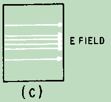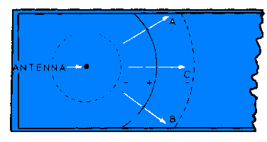 antenna. Positive and negative wavefronts will be radiated, as shown in figure 1-24. Any portion of the wavefront traveling in the direction of arrow C will rapidly decrease to zero because it does not fulfill either of the required boundary conditions. The parts of the wavefronts that travel in the directions of arrows A and B will reflect from the walls and form reverse-phase wavefronts. These two wavefronts, and those that follow, are illustrated in figure 1-25.">