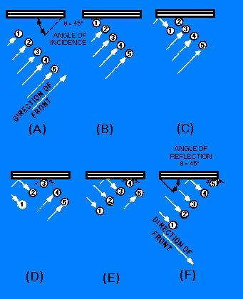 The reflection of a single wavefront off the "b" wall of a waveguide is shown in figure 1-26. The wavefront is shown in view (A) as small particles. In views (B) and (C) particle 1 strikes the wall and is bounced back from the wall without losing velocity. If the wall is perfectly flat, the angle at which it strikes the wall, known as the angle of incidence, is the same as the angle of reflection and are measured perpendicular to the waveguide surface. An instant after particle 1 strikes the wall, particle 2 strikes the wall, as shown in view (C), and reflects in the same manner. Because all the particles are traveling at the same velocity, particles 1 and 2 do not change their relative position with respect to each other. Therefore, the reflected wave has the same shape as the original. The remaining particles as shown in views (D), (E) and (F) reflect in the same manner. This process results in a reflected wavefront identical in shape, but opposite in polarity, to the incident wave. Figure 1-26. - Reflection of a single wavefront.