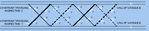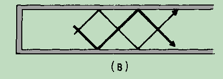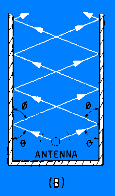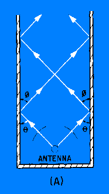 Figure 1-27, views (A) and (B), each illustrate the direction of propagation of two different electromagnetic wavefronts of different frequencies being radiated into a waveguide by a probe. Note that only the direction of propagation is indicated by the lines and arrowheads. The wavefronts are at right angles to the direction of propagation. The angle of incidence (q) and the angle of reflection (;) of the wavefronts vary in size with the frequency of the input energy, but the angles of reflection are equal to each other in a waveguide. The CUTOFF FREQUENCY in a waveguide is a frequency that would cause angles of incidence and reflection to be zero degrees. At any frequency below the cutoff frequency, the wavefronts will be reflected back and forth across the guide (setting up standing waves) and no energy will be conducted down the waveguide. Figure 1-27A. - Different frequencies in a waveguide.
