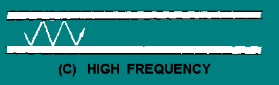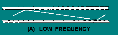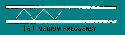 The velocity of propagation of a wave along a waveguide is less than its velocity through free space (speed of light). This lower velocity is caused by the zigzag path taken by the wavefront. The forward-progress velocity of the wavefront in a waveguide is called GROUP VELOCITY and is somewhat slower than the speed of light. The group velocity of energy in a waveguide is determined by the reflection angle of the wavefronts off the "b" walls. The reflection angle is determined by the frequency of the input energy. This basic principle is illustrated in figure 1-28. As frequency is decreased, the reflection angle decreases causing the group velocity to decrease. The opposite is also true; increasing frequency increases the group velocity. Figure 1-28A. - Reflection angle at various frequencies. LOW FREQUENCY