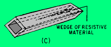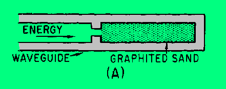 As you may have noticed, horns are really simple antennas. They have several advantages over other impedance-matching devices, such as their large bandwidth and simple construction. The use of horns as antennas will be discussed further in chapter 3. A waveguide may also be terminated in a resistive load that is matched to the characteristic impedance of the waveguide. The resistive load is most often called a DUMMY LOAD, because its only purpose is to absorb all the energy in a waveguide without causing standing waves. There is no place on a waveguide to connect a fixed termination resistor; therefore, several special arrangements are used to terminate waveguides. One method is to fill the end of the waveguide with a graphite and sand mixture, as illustrated in figure 1-45, view (A). When the fields enter the mixture, they induce a current flow in the mixture which dissipates the energy as heat. Another method (view (B)) is to use a high-resistance rod placed at the center of the E field. The E field causes current to flow in the rod, and the high resistance of the rod dissipates the energy as a power loss, again in the form of heat. Figure 1-45A. - Terminating waveguides.