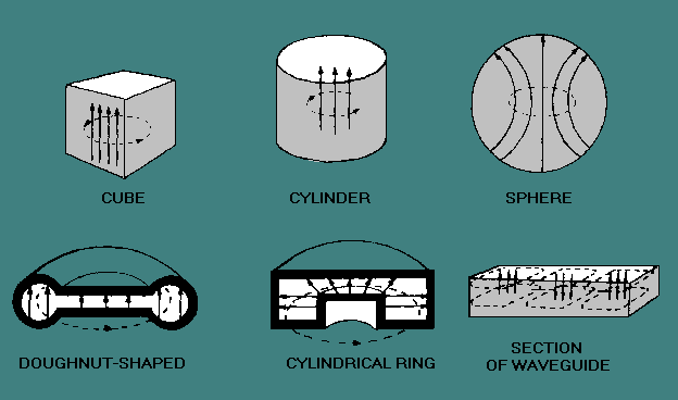 There are two variables that determine the primary frequency of any resonant cavity. The first variable is PHYSICAL SIZE. In general, the smaller the cavity, the higher its resonant frequency. The second controlling factor is the SHAPE of the cavity. Figure 1-60 illustrates several cavity shapes that are commonly used. Remember from the previously stated definition of a resonant cavity that any completely enclosed conductive surface, regardless of its shape, can act as a cavity resonator. Figure 1-60. - Several types of cavities.