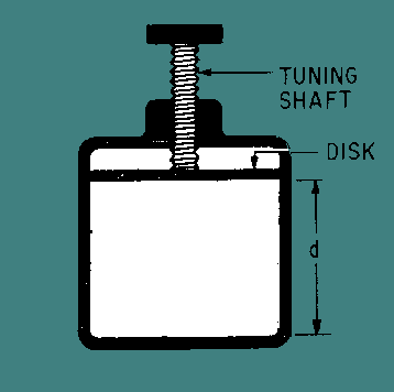 Energy can be inserted or removed from a cavity by the same methods that are used to couple energy into and out of waveguides. The operating principles of probes, loops, and slots are the same whether used in a cavity or a waveguide. Therefore, any of the three methods can be used with cavities to inject or remove energy. The resonant frequency of a cavity can be varied by changing any of three parameters: cavity volume, cavity capacitance, or cavity inductance. Changing the frequencies of a cavity is known as TUNING. The mechanical methods of tuning a cavity may vary with the application, but all methods use the same electrical principles. A mechanical method of tuning a cavity by changing the volume (VOLUME TUNING) is illustrated in figure 1-62. Varying the distance d will result in a new resonant frequency because the inductance and the capacitance of the cavity are changed by different amounts. If the volume is decreased, the resonant frequency will be higher. The resonant frequency will be lower if the volume of the cavity is made larger. Figure 1-62. - Cavity tuning by volume.
