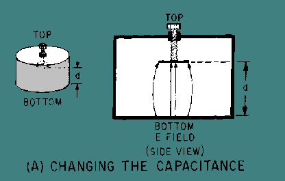 CAPACITIVE TUNING of a cavity is shown in view (A) of figure 1-63. An adjustable slug or screw is placed in the area of maximum E lines. The distance d represents the distance between two capacitor plates. As the slug is moved in, the distance between the two plates becomes smaller and the capacitance increases. The increase in capacitance causes a decrease in the resonant frequency. As the slug is moved out, the resonant frequency of the cavity increases. Figure 1-63A. - Methods of changing the resonant frequency of a cavity. CHANGING THE CAPACITANCE
