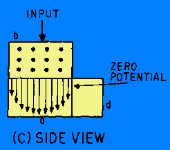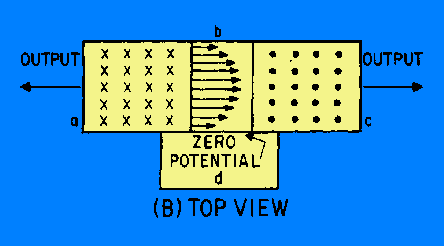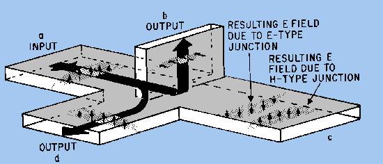magnitude of the E field in the b arm is indicated by the length of the arrows. Since the E lines are at maximum in the center of the b arm and minimum at the edge where the d arm entrance is located, no potential difference exists across the mouth of the d arm.">