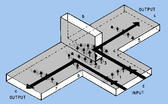 When an input signal is fed into the a arm as shown in figure 1-69, a portion of the energy is coupled into the b arm as it would be in an E-type T junction. An equal portion of the signal is coupled through the d arm because of the action of the H-type junction. The c arm has two fields across it that are out of phase with each other. Therefore the fields cancel, resulting in no output at the c arm. The reverse of this action takes place if a signal is fed into the c arm, resulting in outputs at the b and d arms and no output at the a arm. Figure 1-69. - Magic-T with input to arm a.