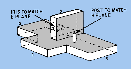 Unfortunately, when a signal is applied to any arm of a magic-T, the flow of energy in the output arms is affected by reflections. Reflections are caused by impedance mismatching at the junctions. These reflections are the cause of the two major disadvantages of' the magic-T. First, the reflections represent a power loss since all the energy fed into the junction does not reach the load which the arms feed. Second, the reflections produce standing waves that can result in internal arching. Thus the maximum power a magic-T can handle is greatly reduced. Reflections can be reduced by using some means of' impedance matching that does not destroy the shape of' the junctions. One method is shown in figure 1-70. A post is used to match the H plane, and an iris is used to match the E plane. Even though this method reduces reflections, it lowers the power-handling capability even further. Figure 1-70. - Magic-T impedance matching.