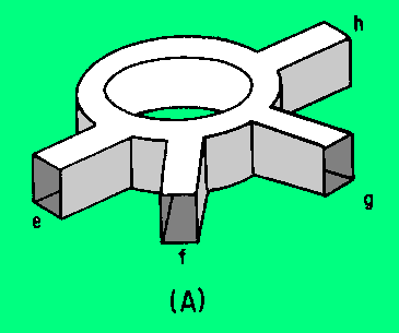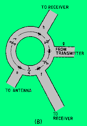 HYBRID RING. - A type of hybrid junction that overcomes the power limitation of the magic-T is the hybrid ring, also called a RAT RACE. The hybrid ring, illustrated in figure 1-71, view (A), is actually a modification of the magic-T. It is constructed of' rectangular waveguides molded into a circular pattern. The arms are joined to the circular waveguide to form E-type T junctions. View (B) shows, in wavelengths, the dimensions required for a hybrid ring to operate properly. Figure 1-71A. - Hybrid ring with wavelength measurements.