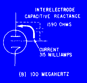 MICROWAVE COMPONENTS The waveguides discussed in chapter 1 serve to transport microwave energy from one place to another. Energy is transported after it has been generated or amplified in a previous stage of the circuit. In this chapter you will be introduced to the special components used in those circuits. Microwave energy is used in both radar and communications applications. The fact that the frequencies are very high and the wavelengths very short presents special problems in circuit design. Components that were previously satisfactory for signal generation and amplification use are no longer useful in the microwave region. The theory of operation for these components is discussed in this chapter. Because the theory of operation is sometimes difficult to understand, you need to pay particular attention to detail as you study this chapter. It is written in the simplest manner possible while retaining the necessary technical complexity. The efficiency of conventional tubes is largely independent of frequency up to a certain limit. When frequency increases beyond that limit, several factors combine to rapidly decrease tube efficiency. Tubes that are efficient in the microwave range usually operate on the theory of VELOCITY MODULATION, a concept that avoids the problems encountered in conventional tubes. Velocity modulation is more easily understood if the factors that limit the frequency range of a conventional tube are thoroughly understood. Therefore, the frequency limitations of conventional tubes will be discussed before the concepts and applications of velocity modulation are explained. You may want to review NEETS, Module 6, Introduction to Electronic Emission, Tubes, and Power Supplies, Chapters 1 and 2, for a refresher on vacuum tubes before proceeding. Frequency Limitations of Conventional Tubes Three characteristics of ordinary vacuum tubes become increasingly important as frequency rises. These characteristics are interelectrode capacitance, lead inductance, and electron transit time. The INTERELECTRODE CAPACITANCES in a vacuum tube, at low or medium radio frequencies, produce capacitive reactances that are so large that no serious effects upon tube operation are noticeable. However, as the frequency increases, the reactances become small enough to materially affect the performance of a circuit. For example, in figure 2-1, view (A), a 1-picofarad capacitor has a reactance of 159,000 ohms at 1 megahertz. If this capacitor was the interelectrode capacitance between the grid and plate of a tube, and the rf voltage between these electrodes was 500 volts, then 3.15 milliamperes of current would flow through the interelectrode capacitance. Current flow in this small amount would not seriously affect circuit performance. On the other hand, at a frequency of 100 megahertz the reactance would decrease to approximately 1,590 ohms and, with the same voltage applied, current would increase to 315 milliamperes (view (B)). Current in this amount would definitely affect circuit performance. Figure 2-1A. - Interelectrode capacitance in a vacuum tube. 1 MEGAHERTZ Figure 2-1B. - Interelectrode capacitance in a vacuum tube. 100 MEGAHERTZ