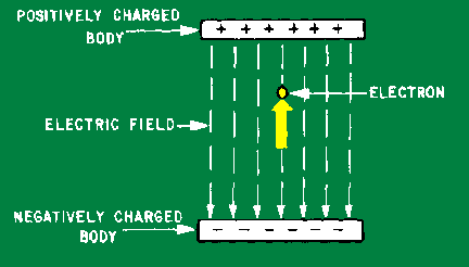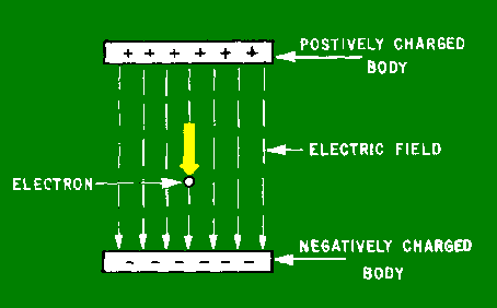 As figure 2-3 illustrates, the opposite condition is also true. An electron traveling in the same direction as the electrostatic lines of force will decelerate by giving up energy to the field. The negatively charged body will repel the electron and cause it to decrease in velocity. When the velocity is reduced, the energy level is also reduced. The energy lost by the electron is gained by the electrostatic field. Figure 2-3. - Moving electron losing energy and velocity.