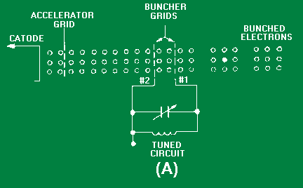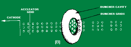 The operation of a velocity-modulated tube depends on a change in the velocity of the electrons passing through its electrostatic field. A change in electron velocity causes the tube to produce BUNCHES of electrons. These bunches are separated by spaces in which there are relatively few electrons. Velocity modulation is then defined as that variation in the velocity of a beam of electrons caused by the alternate speeding up and slowing down of the electrons in the beam. This variation is usually caused by a voltage signal applied between the grids through which the beam must pass. The first requirement in obtaining velocity modulation is to produce a stream of electrons which are all traveling at the same speed. The electron stream is produced by an electron gun. A simplified version of an electron gun is shown in figure 2-4, view (A). Electrons emitted from the cathode are attracted toward the positive accelerator grid and all but a few of the electrons pass through the grid and form a beam. The electron beam then passes through a pair of closely spaced grids, called BUNCHER GRIDS. Each grid is connected to one side of a tuned circuit. The parallel-resonant tuned circuit (view (A)) in the illustration represents the doughnut-shaped resonant cavity surrounding the electron stream (view (B)). The buncher grids are the dashed lines at the center of the cavity and are at the same dc potential as the accelerator grid. The alternating voltage which exists across the resonant circuit causes the velocity of the electrons leaving the buncher grids to differ from the velocity of the electrons arriving at the buncher grids. The amount of difference depends on the strength and direction of the electrostatic field within the resonant cavity as the electrons pass through the grids. Figure 2-4A. - Electron gun with buncher grids.