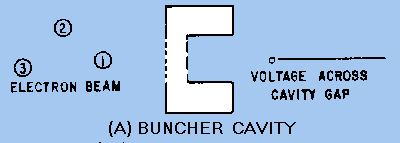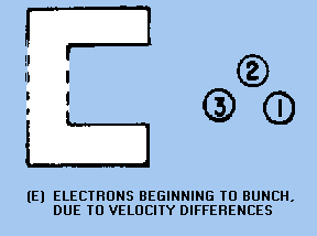 Figure 2-5E. - Buncher cavity action. ELECTRONS BEGINNING TO BUNCH, DUE TO VELOCITY DIFFERENCES