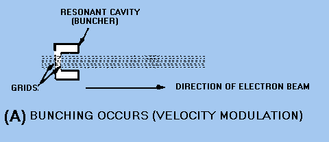 frequency spectrum went beyond 1,000 megahertz and into the microwave range. The microwave tube uses transit time in the conversion of dc power to radio-frequency (rf) power. The interchange of power is accomplished by using the principle of electron VELOCITY MODULATION and low-loss resonant cavities in the microwave tube. ">