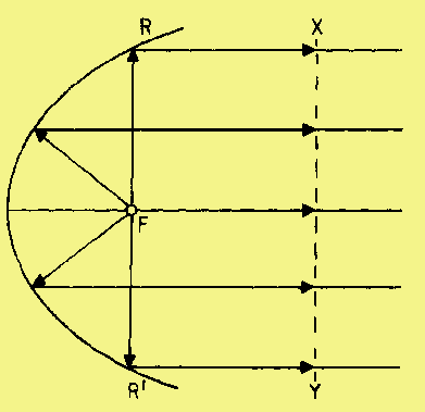 A spherical wavefront (one in which the energy spreads out in all directions) spreads out as it travels away from the antenna and produces a pattern that is not very directional. A wavefront that exists in only one plane does not spread because all of the wavefront moves forward in the same direction. For an antenna to be highly directive, it must change the normally spherical wavefront into a plane wavefront. Many highly directive microwave antennas produce a plane wavefront by using a reflector to focus the radiated energy. The PARABOLIC REFLECTOR is most often used for high directivity. Microwaves travel in straight lines as do light rays. They can also be focused and reflected just as light rays can, as illustrated by the antenna shown in figure 3-2. A microwave source is placed at focal point F. The field leaves this antenna as a spherical wavefront. As each part of the wavefront reaches the reflecting surface, it is phase-shifted 180 degrees. Each part is then sent outward at an angle that results in all parts of the field traveling in parallel paths. Because of the special shape of a parabolic surface, all paths from F to the reflector and back to line XY are the same length. Therefore, when the parts of the field are reflected from the parabolic surface, they travel to line XY in the same amount of time. Figure 3-2. - Parabolic reflector radiation.