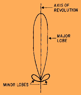 If a dipole is used as the source of transmission, energy will be radiated from the antenna into space as well as toward the reflector. Energy which is not directed toward the paraboloid has a wide-beam characteristic which will destroy the narrow pattern of the parabolic reflector. However, a HEMISPHERICAL SHIELD (not shown) may be used to direct most of the radiation toward the parabolic surface and thus prevent the destruction of the narrow pattern. Direct radiation into space is eliminated, the beam is made sharper, and more power is concentrated in the beam. Without the shield, some of the radiated field would leave the radiator directly. Since this part of the field that would leave the radiator would not be reflected, it would not become a part of the main beam and could serve no useful purpose. In figure 3-3 the radiation pattern of a paraboloid reflector contains a major lobe and several minor lobes. The major lobe is directed along the axis of revolution. Very narrow beams are possible with this type of reflector. Figure 3-4 illustrates the basic paraboloid reflector. Figure 3-3. - Parabolic radiation pattern.
