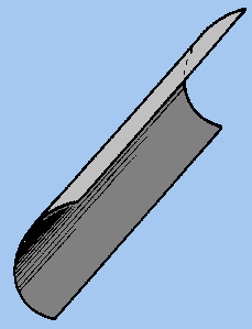 Orange-Peel Paraboloid A section of a complete circular paraboloid, often called an ORANGE-PEEL REFLECTOR because of its orange-peel shape, is shown in figure 3-6. Since the reflector is narrow in the horizontal plane and wide in the vertical plane, it produces a beam that is wide in the horizontal plane and narrow in the vertical plane. In shape, the beam resembles a huge beaver tail. The microwave energy is sent into the parabolic reflector by a horn radiator (not shown) which is fed by a waveguide. The horn radiation pattern covers nearly the entire shape of the reflector, so almost all of the microwave energy strikes the reflector and very little escapes at the sides. Antenna systems which use orange-peel paraboloids are often used in height-finding equipment. Figure 3-6. - Orange-peel paraboloid.