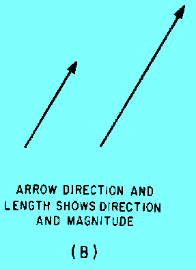 The basic alternating waveform for all complex waveforms is the sine wave. Therefore, an understanding of sine wave characteristics and how they can be acted upon is essential for you to understand modulation. You may want to review sine waves in chapter 1 of NEETS, Module 2, Introduction to Alternating Current and Transformers at this point. Since numbers represent individual items in a group, arrows can be used to represent quantities that have magnitude and direction. This may be done by using an arrow and a number, as illustrated in figure 1-1, view (A). The number represents the magnitude of force and the arrow represents the direction of the force. Figure 1-1A. - Vectors representing magnitude and direction. View (B) illustrates a simpler method of representation. In this method, the length of the arrow is proportional to the magnitude of force, and the direction of force is indicated by the direction of the arrow. Thus, if an arrow 1-inch long represents 50 pounds of force, then an arrow 2-inches long would represent 100 pounds of force. This method of showing both magnitude and direction is called a VECTOR. To more clearly show the relationships between the amplitude, phase, and frequency of a sine wave, we will use vectors. Figure 1-1B. - Vectors representing magnitude and direction.