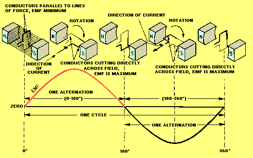 Vector Applied to Sine-Wave Generation As covered, in NEETS, Module 2, Introduction to Alternating Current and Transformers, an alternating current is generated by rotating a coil in the magnetic field between two magnets. As long as the magnetic field is uniform, the output from the coil will be a sine wave, as shown in figure 1-2. This wave shape is called a sine wave because the voltage of the coil depends on its angular position in the magnetic field. Figure 1-2. - Sine-wave generator.