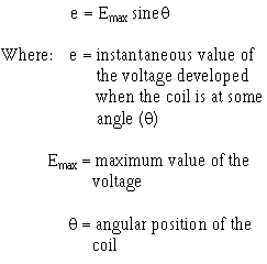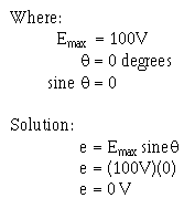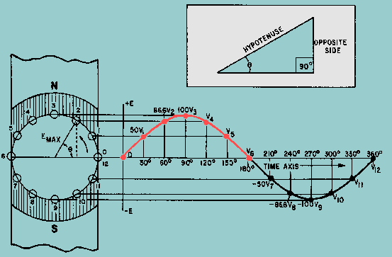 When an alternating waveform is generated, the coil is represented by a vector which has a length that is equal to the maximum output voltage (Emax). The output voltage at any given angle can be found by applying the above trigonometric function. Because the output voltage is in direct relationship with the sine of the angle q, it is commonly called a sine wave.You can see this relationship more clearly in figure 1-3 where the coil positions in relation to time are represented by the numbers 0 through 12. The corresponding angular displacements, shown as q, are shown along the horizontal time axis. The induced voltages (V1 through V12) are plotted along this axis. Connecting the induced voltage points, shown in the figure, forms a sine-wave pattern. This relationship can be proven by taking any coil position and applying the trigonometric function to an equivalent right triangle. When the vector is placed horizontally (position 0), the angle q is 0 degrees. Since e = Emax sine q, and the sine of 0 degrees is 0, the output voltage is 0 volts, as shown below: