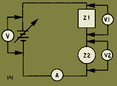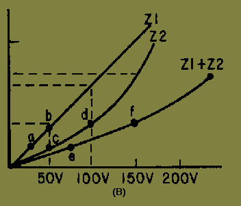 As the applied voltage is varied, ammeter readings which correspond with the various voltages can be recorded. For example, assume that 50 volts yields 0.4 milliampere (point a), 100 volts produces 1 milliampere (point b), and 150 volts causes 2.2 milliamperes (point c). Current through the nonlinear impedance does not vary proportionally with the voltage; the chart is not a straight line. Therefore, Z is a nonlinear impedance; that is, the current through the impedance does not faithfully follow the change in voltage. Various combinations of voltage and current for this particular nonlinear impedance may be obtained by use of this voltage-current curve. COMBINED LINEAR AND NONLINEAR IMPEDANCES The series combination of a linear and a nonlinear impedance is illustrated in view (A) of figure 1-9. The voltage-current charts of Z1 and Z2 are shown in view (B). A chart of the combined impedance can be plotted by adding the amount of voltage required to produce a particular current through linear impedance Z1 to the amount of voltage required to produce the same amount of current through nonlinear impedance Z2. The total will be the amount of voltage required to produce that particular current through the series combination. For example, point a (25 volts) is added to point c (50 volts) which yields point e (75 volts); and point b (50 volts) is added to point d (100 volts) which yields point f (150 volts). Intermediate points may be determined in the same manner and the resultant characteristic curve (Z1 + Z2) is obtained for the series combination. Figure 1-9A. - Combined linear and nonlinear impedances.
