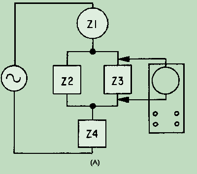 The amplitude, on the other hand, may differ from the amplitude of the applied voltage. Furthermore, the phase of the voltage developed by any of the impedances may not be identical to the phase of the voltage across any of the other impedances or the phase of the applied voltage. If an impedance is a reactive component (coil or capacitor), voltage or current may lead or lag, but the wave shape will remain the same. In a linear circuit, the output of the generator is not distorted. The frequency remains the same throughout the entire circuit and no new frequencies are generated. View (A) of figure 1-11 illustrates a circuit that contains a combination of linear and nonlinear impedances with a sine wave of voltage applied. Impedances Z2, Z3, and Z4 are linear; and Z1 is nonlinear. The result of a linear and nonlinear combination of impedances is a nonlinear waveform. The curve Z, shown in view (B), is the nonlinear curve for the circuit of view (A). Because of the nonlinear impedance, current can flow in the circuit only during the positive alternation of the sine-wave generator. If an oscilloscope is connected, as shown in view (A), the waveform across Z3 will not be a sine wave. Figure 1-12, view (A), illustrates the sine wave from the generator and view (B) shows the waveform across the linear impedance Z3. Notice that the nonlinear impedance Z1 has eliminated the negative half cycles. Figure 1-11A. - Circuit with nonlinear impedances.