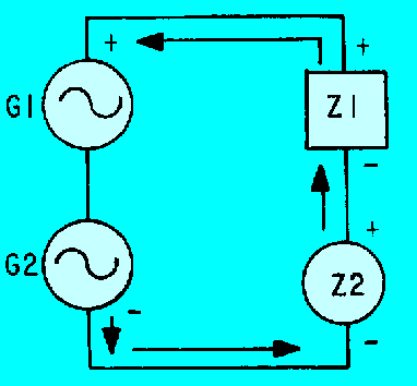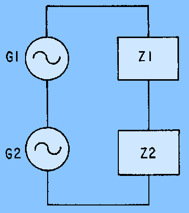 voltage applied to Z1 and Z2 will be the vector sum of the generator voltages. The sum of the individual instantaneous voltages across each impedance will equal the applied voltages. Figure 1-13. - Two sine-wave generators with linear impedances. ">