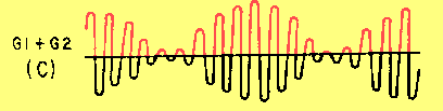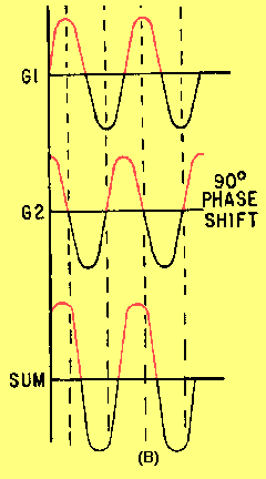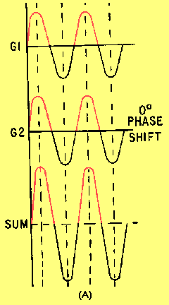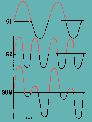 The sum and difference frequencies occur because the phase angles of the two fundamentals are constantly changing. If generator G1 produces a 10-hertz voltage and generator G2 produces an 11-hertz voltage, the waveforms produced because of the nonlinear impedance will be as shown in the following list: