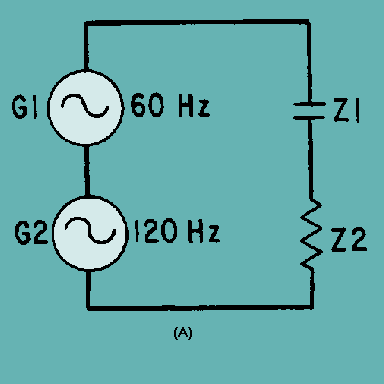 If the two sine wave generators are of different frequencies, then the sum of the instantaneous values will appear as a complex wave across the impedances, as shown in figure 1-15, views (A) and (B). To determine the wave shape across each individual impedance, assume only one generator is connected at a time and compute the sine-wave voltage developed across each impedance for that generator input. Then, combine the instantaneous voltages (caused by each generator input) to obtain the complex waveform across each impedance. The nature of the impedance (resistive or reactive) will determine the shape of the complex waveform. Because the complex waveform is the sum of two individual sine waves, the composite waveform contains only the two original frequencies. Figure 1-15A. - Sine-wave generators with different frequencies and linear impedances.