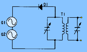 TYPICAL HETERODYNING CIRCUIT Two conditions must be met in a circuit for heterodyning to occur. First, at least two different frequencies must be applied to the circuit. Second, these signals must be applied to a nonlinear impedance. These two conditions will result in new frequencies (sum and difference) being produced. Any one of the frequencies can be selected by placing a frequency-selective device (such as a tuned tank circuit) in series with the nonlinear impedance in the circuit. Figure 1-19 illustrates a basic heterodyning circuit. The diode D1 serves as the nonlinear impedance in the circuit. Generators G1 and G2 are signal sources of different frequencies. The primary of T1, with its associated capacitance, serves as the frequency-selective device. Figure 1-19. - Typical heterodyning circuit.