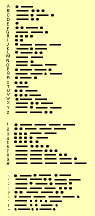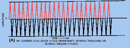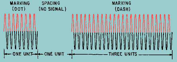 AMPLITUDE-MODULATED SYSTEMS Amplitude modulation refers to any method of varying the amplitude of an electromagnetic carrier frequency in accordance with the intelligence to be transmitted by the carrier. The CARRIER frequency is a radio-frequency wave suitable for modulation by the intelligence to be transmitted. One form of this method of modulation is simply to interrupt the carrier in accordance with a prearranged code. CONTINUOUS WAVE (CW) The "on-off" KEYING of a continuous wave (cw) carrier frequency was the principal method of modulating a carrier in the early days of electrical communications. The intervals of time when a carrier either was present or absent conveyed the desired intelligence. This is still used in modern communications. When applied to a continuously oscillating radio-frequency source, on-off keying is referred to as cw signaling. This type of communication is sometimes referred to as an interrupted continuous wave (icw). Development The use of a cw transmitter can be very simple. All that is required for the transmitter to work properly is a device to generate the oscillations, a method of keying the oscillations on and off, and an antenna to radiate the energy. Continuous wave was the first type of modulation used. It is still extensively used for long-range communications. When Marconi and others were attempting the transfer of intelligence between two points, without reliance on a conducting path, they employed the use of a practical coding system known as Morse code. You probably know that Morse code is a system of on-off keying developed for telegraph that is capable of passing intelligence over wire at an acceptable rate. Morse code consists only of periods of signal and no-signal. Figure 1-20 is the International Morse code used with telegraphy and cw modulation. Each character in the code is made up of a series of elements referred to as DOTS or DASHES. These are short (dot) and long (dash) bursts of signal separated by intervals of no signal. The dot is the basic time element of the code. The dash has three times the duration of a dot interval. The waveforms for both are shown in figure 1-21. The elements within each character are separated by intervals of no signal with a time duration of one dot. The characters are separated by a no-signal interval equal in duration to one dash. Each interval during which signal is present is called the MARKING interval, and the period of no signal is called the SPACING interval. Figure 1-22 shows the relationships between the rf carrier view (A), the on-off keying waveform view (B), and the resultant carrier wave view (C). Figure 1-20. - International Morse code.