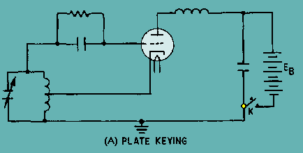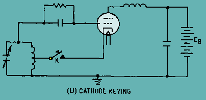 Keying Methods Keying a transmitter causes an rf signal to be radiated only when the key contacts are closed. When the key contacts are open, the transmitter does not radiate energy. Keying is accomplished in either the oscillator or amplifier stage of a transmitter. A number of different keying systems are used in Navy transmitters. In most Navy transmitters, the hand telegraph key is at a low-voltage potential with respect to ground. A keying bar is usually grounded to protect the operator. Generally, a keying relay, with its contacts in the center-tap lead of the filament transformer, is used to key the equipment. Because one or more stages use the same filament transformer, these stages are also keyed. A class C final amplifier, when operated with fixed bias, is usually not keyed. This is because no output occurs when no excitation is applied in class C operation. Keying the final amplifier along with the other stages is not necessary in this case. OSCILLATOR KEYING. - Two methods of OSCILLATOR KEYING are shown in figure 1-23. In view (A) the grid circuit is closed at all times. The key (K) opens and closes the negative side of the plate circuit. This system is called PLATE KEYING. When the key is open, no plate current can flow and the circuit does not oscillate. In view (B), the cathode circuit is open when the key is open and neither grid current nor plate current can flow. Both circuits are closed when the key is closed. This system is called CATHODE KEYING. Although the circuits of figure 1-23 may be used to key amplifiers, other keying methods are generally employed because of the high values of plate current and voltage encountered. Figure 1-23A. - Oscillator keying.