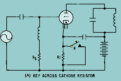 BLOCKED-GRID KEYING. - Two methods of BLOCKED-GRID KEYING are shown in figure 1-24. The key in view (A) shorts cathode resistor R1 allowing normal plate current to flow. With the key open, reduced plate current flows up through resistor R1 making the end connected to grid resistor Rg negative. If R1 has a high enough value, the bias developed is sufficient to cause cutoff of plate current. Depressing the key short-circuits R1. This increases the bias above cutoff and allows the normal flow of plate current. Grid resistor Rg is the usual grid-leak resistor for normal biasing. Figure 1-24A. - Blocked-grid keying.