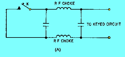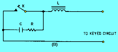KEY CLICKS. - Ideally, cw keying a transmitter should instantly start and stop radiation of the carrier completely. However, the sudden application and removal of power causes rapid surges of current which may cause interference in nearby receivers. Even though such receivers are tuned to frequencies far removed from that of the transmitter, interference may be present in the form of "clicks" or "thumps." KEY-CLICK FILTERS are used in the keying systems of radio transmitters to prevent such interference. Two types of key-click filters are shown in figure 1-26. Figure 1-26A. - Key-click filters.