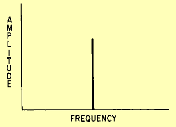 The capacitors and rf chokes in figure 1-26, views (A) and (B), prevent surges of current. In view (B), the choke coil causes a lag in the current when the key is closed, and the current builds up gradually instead of instantly. The capacitor charges as the key is opened and slowly releases the energy stored in the magnetic field of the inductor. The resistor controls the rate of charge of the capacitor and also prevents sparking at the key contacts by the sudden discharge of the capacitor when the key is closed. MACHINE KEYING. - The speed with which information can be transmitted using a hand key depends on the keying ability of the operator. Early communicators turned to mechanized methods of keying the transmitters to speed transmissions. More information could be passed in a given time by replacing the hand-operated key with a keying device capable of reading information from punched tape. Using this method, several operators could prepare tapes at their normal operating speed. The tapes could then be read through the keying device at a higher rate of speed and more information could be transmitted in a given amount of time. Spectrum Analysis Continuous-wave transmission has the disadvantage of being a relatively slow transmission method. Still, it has several advantages. Some of the advantages of cw transmission are a high degree of clarity under severe noise conditions, long-range operation, and narrow bandwidth. A highly skilled operator can pick out and read a cw signal even though it has a high degree of background noise or interference. Since only a single-carrier frequency is being transmitted, all of the transmitter power can be concentrated in the intelligence. This concentration of power gives the transmission a greater range. The use of spectrum analysis (figure 1-27) illustrates the transmitted frequency characteristics of a cw signal. Because the cw signal is a pure sine wave, it occupies only a single frequency in the rf spectrum and the system is relatively simple. Figure 1-27. - Carrier-wave signal spectrum analysis.